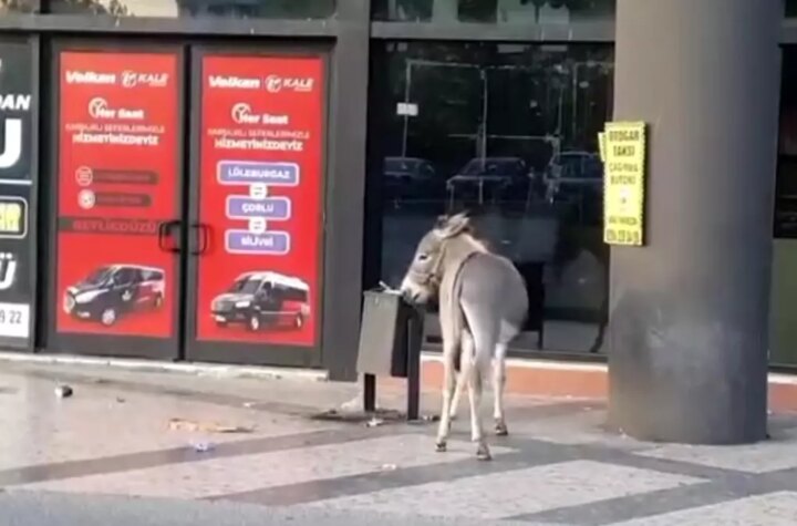 Edirne Otogarı'nda başıboş dolaşan bir eşek, yol dubasını ağzına alarak kaçtı. Eşek, peşinden koşan...