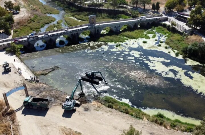 Kurak yaz ayları nedeniyle debisi düşen Tunca Irmağı, Edirne'de Devlet Su İşleri grupları tarafından...