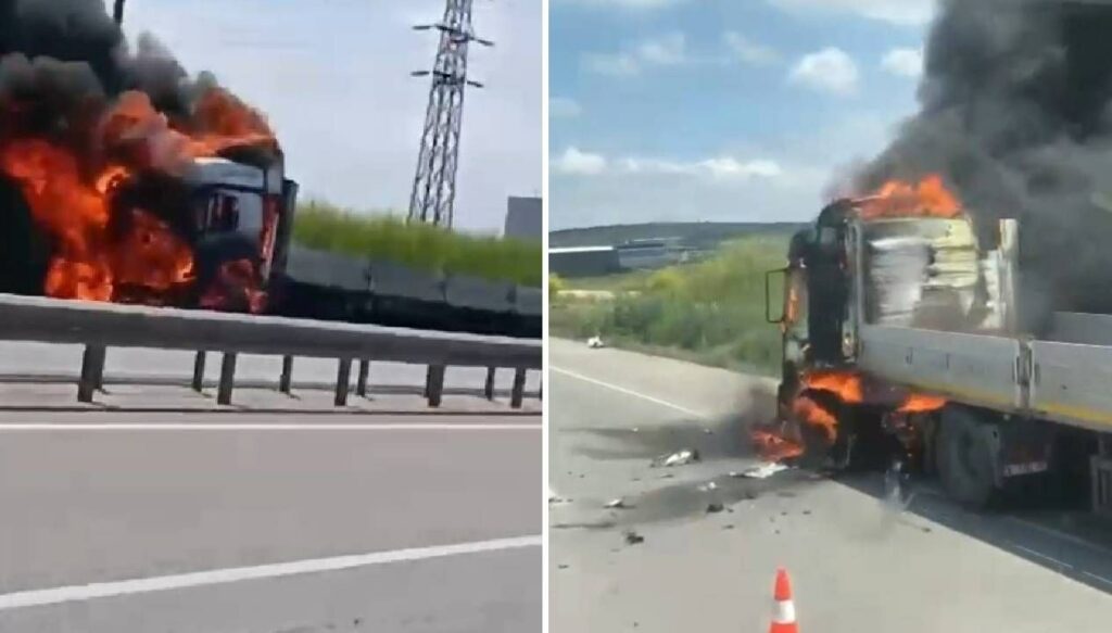 Sürücü, kendi imkanlarıyla yanan TIR’ı söndürmeye çalışsa da mümkün olmadı.